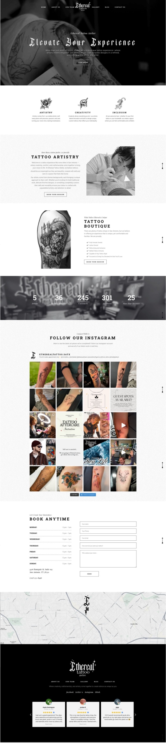 The new site reestablished Ethereal Tattoo Atelier’s online presence and gave them a polished, professional platform to attract new clients. The live social feed keeps the site fresh with new content, and the artist bios allow visitors to connect with the studio’s creative identity. Overall, the site has become a strong extension of the brand and a valuable tool for growing their client base.